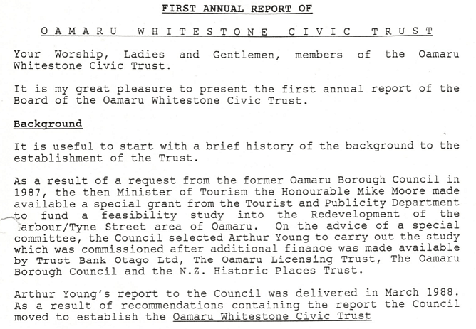 An interesting piece of Oamaru Whitestone Civic Trust history - The first annual report, at the first AGM, 1990, by the Chairman, Mr J D Polson.