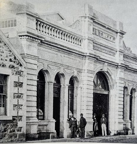 Meeks Store is unique among the buildings on Harbour Street as it is the only building that the original ornate entablature and facade was not removed. This solid and mostly overlooked Victorian building designed by Forrester and Lemon was amongst the founding buildings of the The Oamaru Whitestone Civic Trust, built for J and T Meek in 1876. It also makes it one of the earliest buildings to be built on Harbour Street, with the act of Parliament that created the Harbour endowment in 1874. Built as part of the Meek's milling empire and designed to hold 30,000 sacks of grain, like many other buildings on Harbour Street Meeks Store had a water engine to power the equipment. By the 1920s the building was owned by Darling & McDowell, who installed the large grass seed cleaning machines that are still in the building today. As the production of grain declined the building use changed too and eventually became a Woolstore. Over the last 149 years it has had many owners after Darling and McDowell it passed to Northern Farmers, Wrightsons and Dalgetys before being sold to the Trust in the mid 1980s. Today the building needs restoration work to stabilise its facade, and repair the damage caused by the Oamaru stone being covered in
