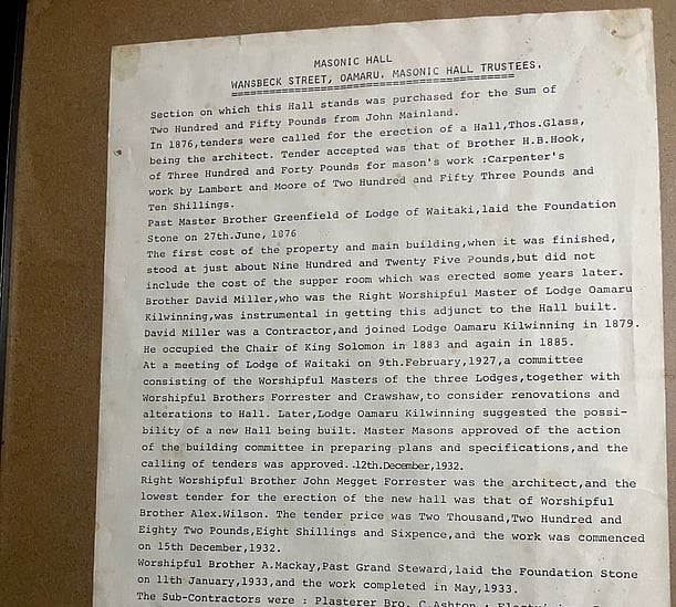 At a meeting of Lodge of Waitaki on 9 February 1927 a committee consisting of the Worshipful Masters of the three Lodges, together with Worshipful Brothers Forrester and Crawshaw, to consider renovations and alterations to the hall. Later, Lodge Oamaru Kilwinning suggested the possibility of a new hall being built. Master Masons approved of the action of the building committee in preparing plans and specifications, and the calling of tenders was approved on 12 December 1932.